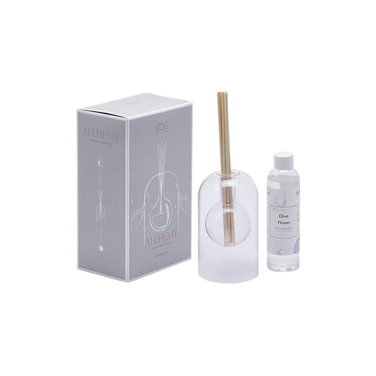 Dekorative duftpinner i rosa gassbeholder fra Enzo De Gasperi. Duft "Olive Flower".