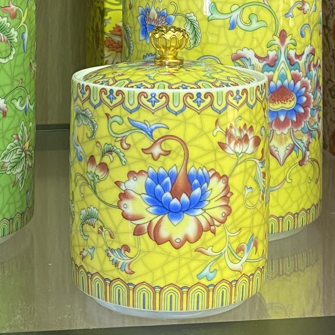 Nydelig duftlys i ming-serien fra italienske EDG - Enzo de Gasperi. Inspirert av Ming-dynastiets vaser med en fargerik & praktfullt dekorert krukke med lokk. Duftnoter av ananas og kokosnøtt, duften av sydligere strøk.