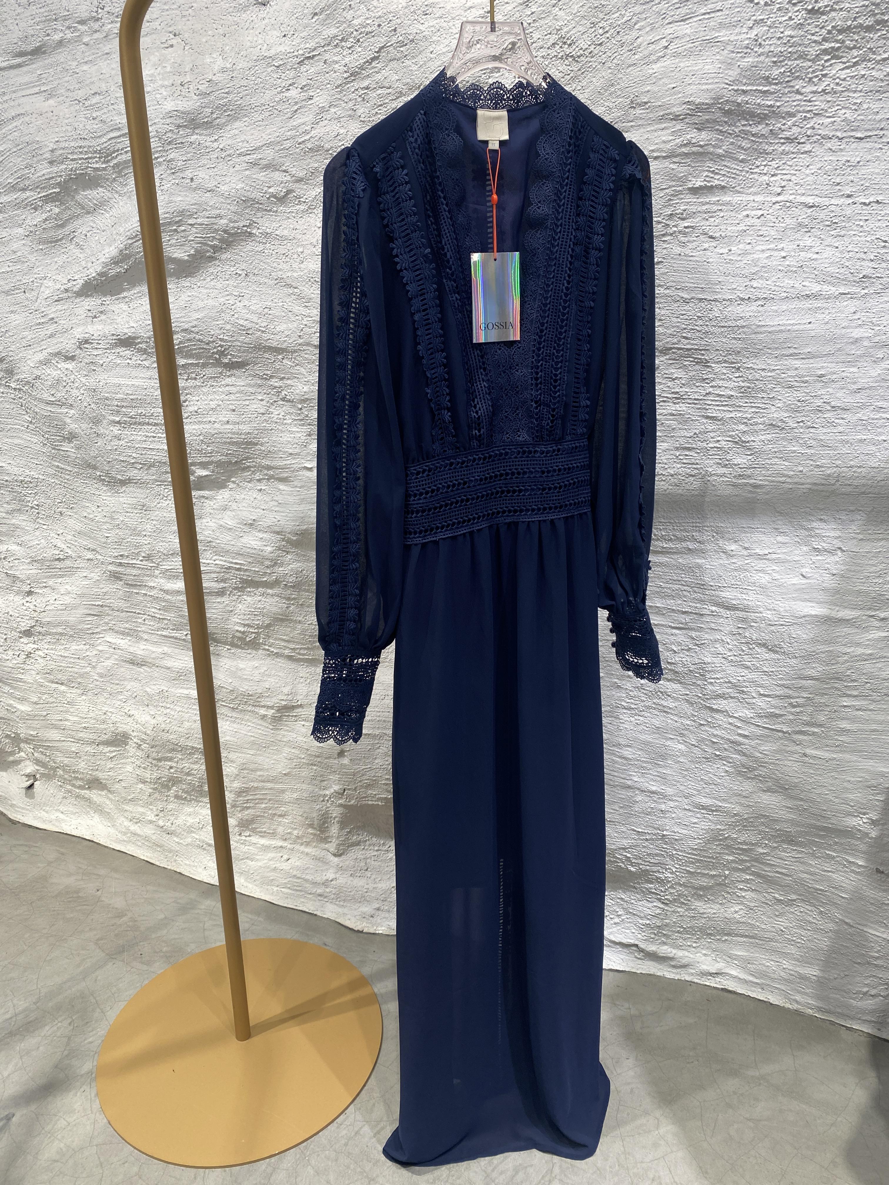 Lekker selskapskjole fra danske Gossia. Blondedetaljer, V-hals & bånd i livet. Splitter i sidene.