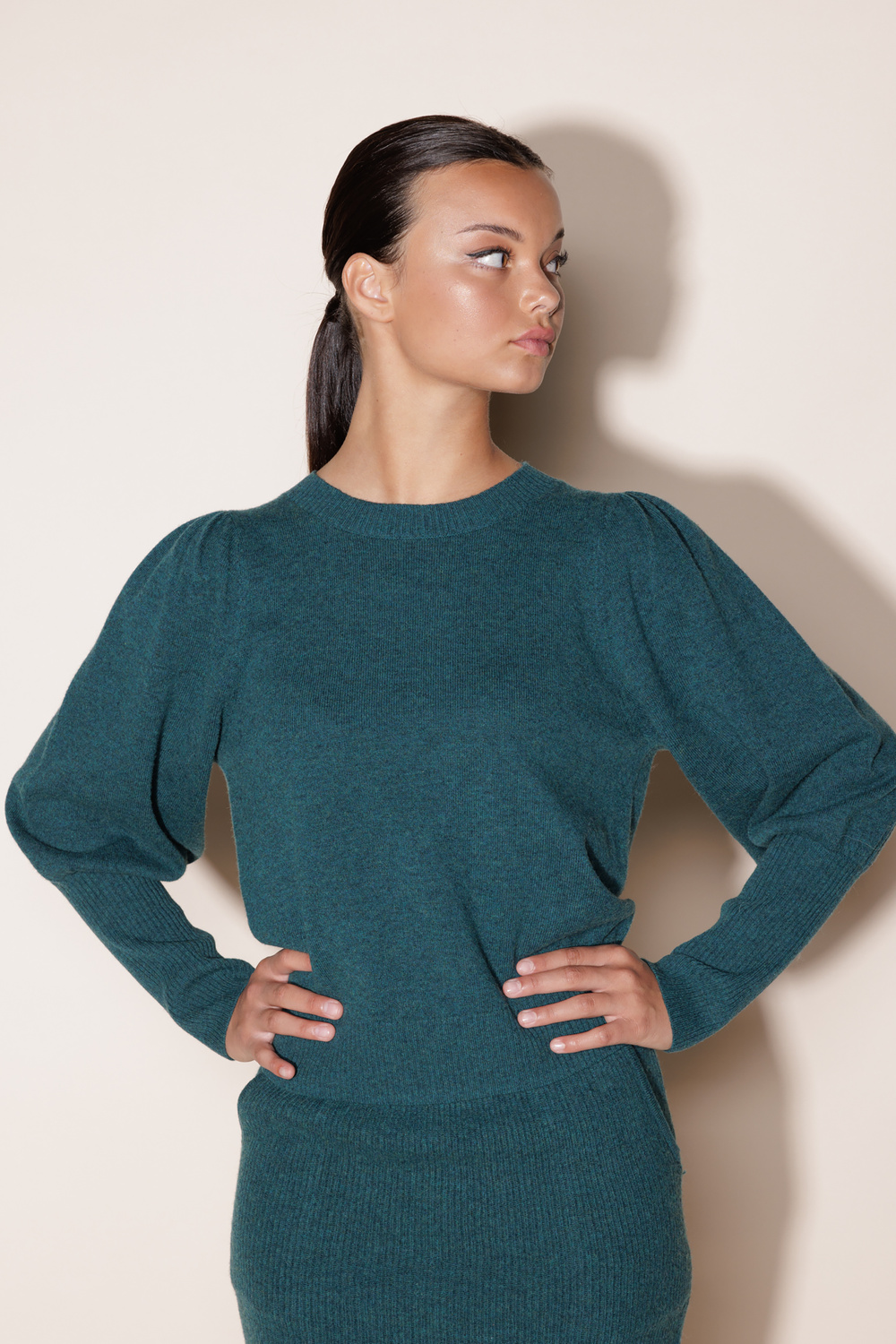 Nydelig genser fra norske Woodling. Tynn strikk med rund hals & puffermer med smale mansjetter.