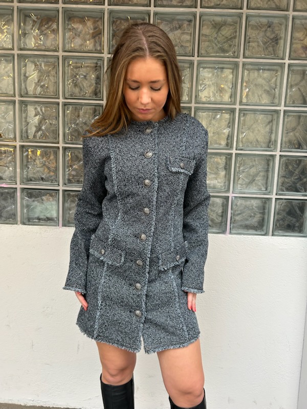 Tweed-kjole fra Gestuz med fine detaljer. Frontkneppet.