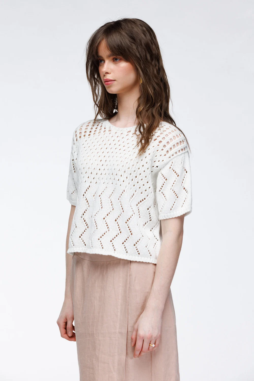 Mønsterstrikket topp fra norske Woodling. Korte ermer. Produsert på Sæland/Norge.