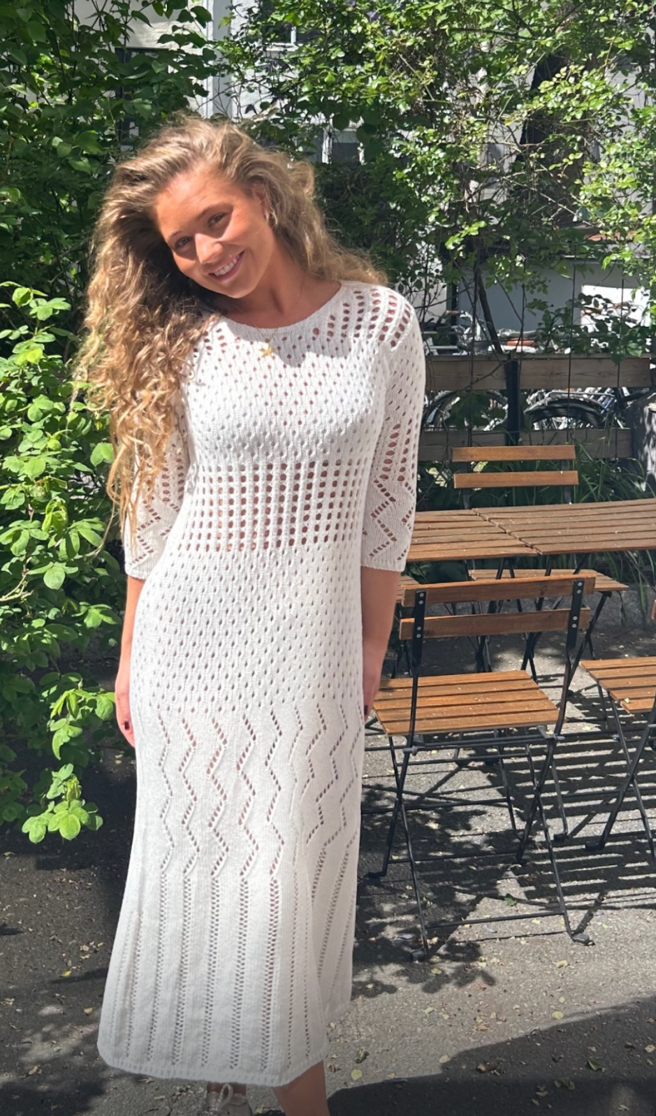 Mønsterstrikket kjole fra norske Woodling. 3/4-erm & ankellengde. Produsert på Sæland/Norge.