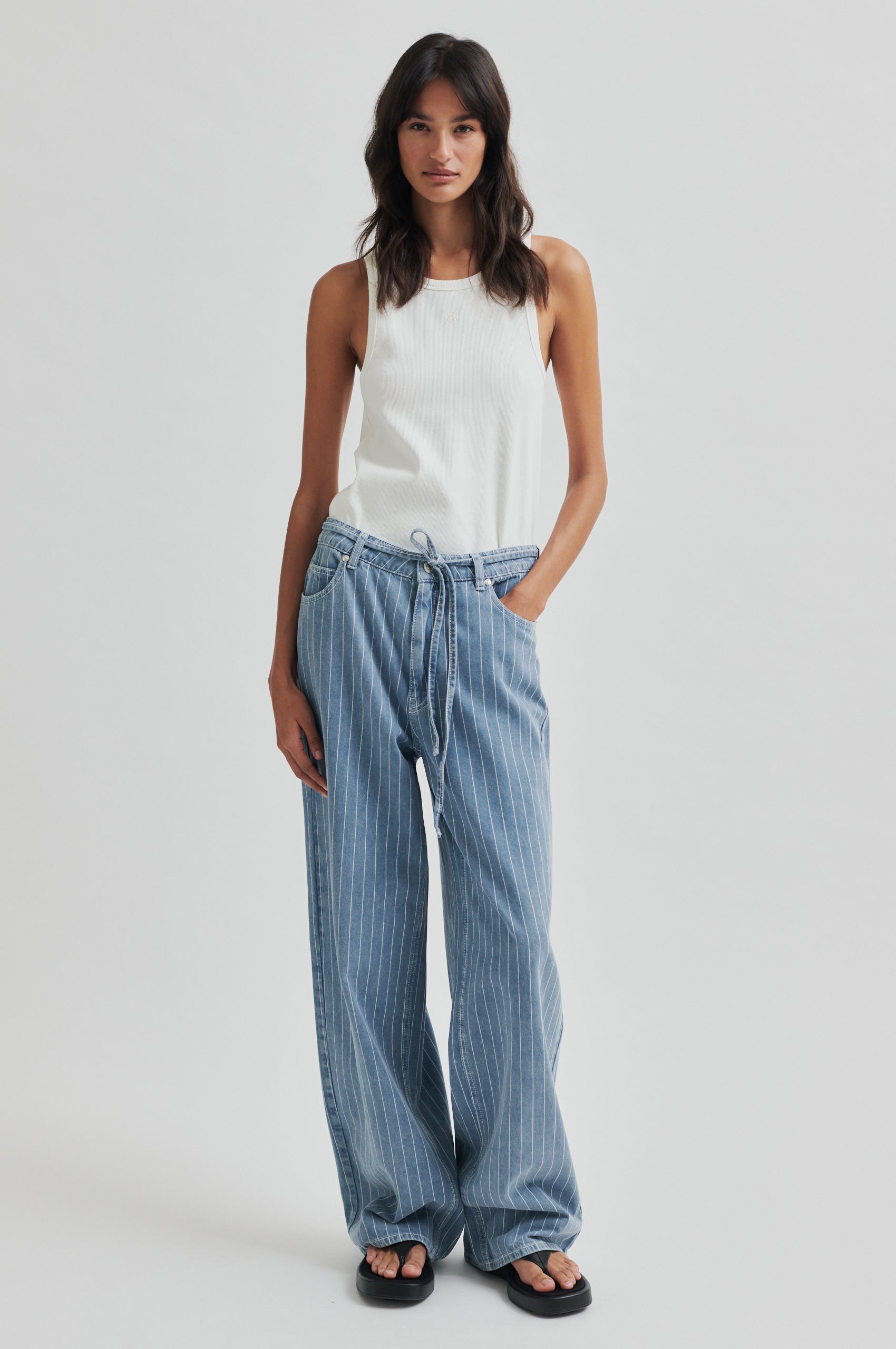 Denim med pinstripe & knyting i livet fra Second Female. Vid, rett modell.