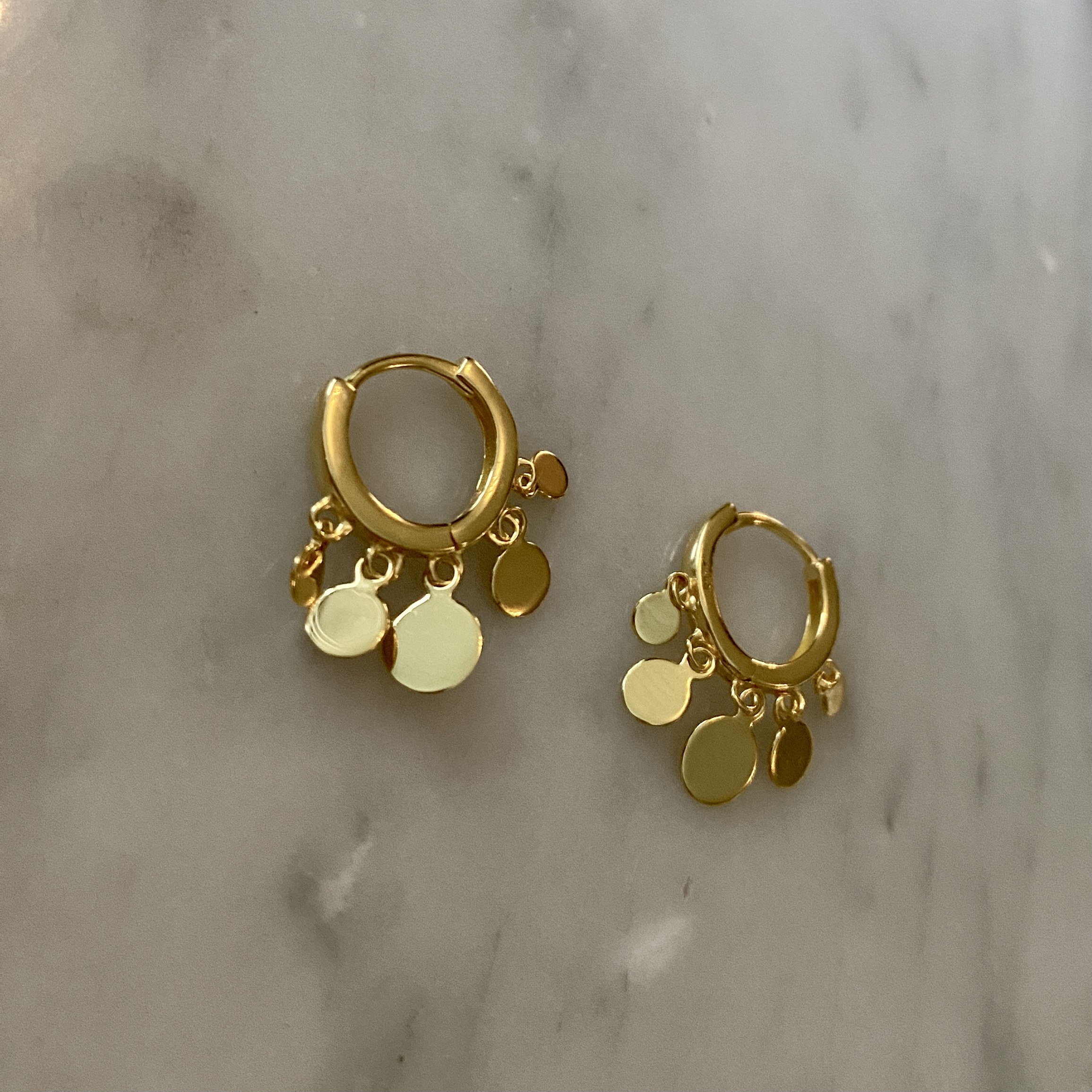 Liten gullbelagt ørering med mini "mynter" fra Khione. Selges én & én, velg 2stk for par.