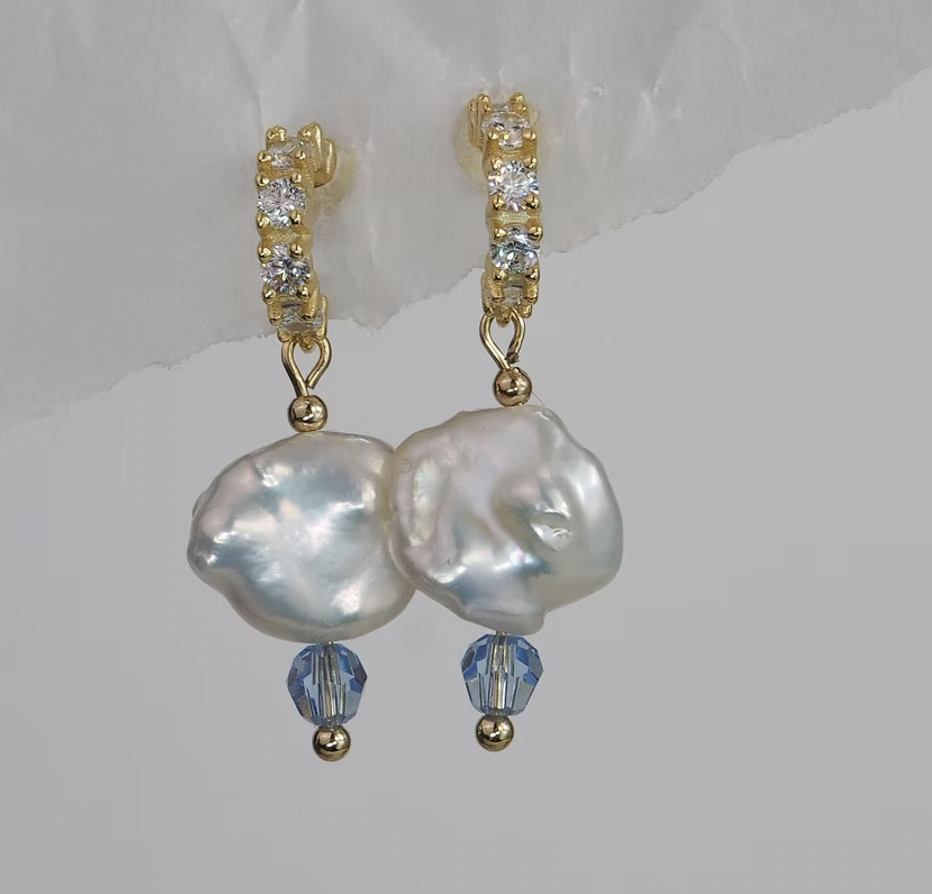 Ørering i gullforgylt sølv og zirkoner. Anheng i gullforgylt messing og ferskvannsperle.
