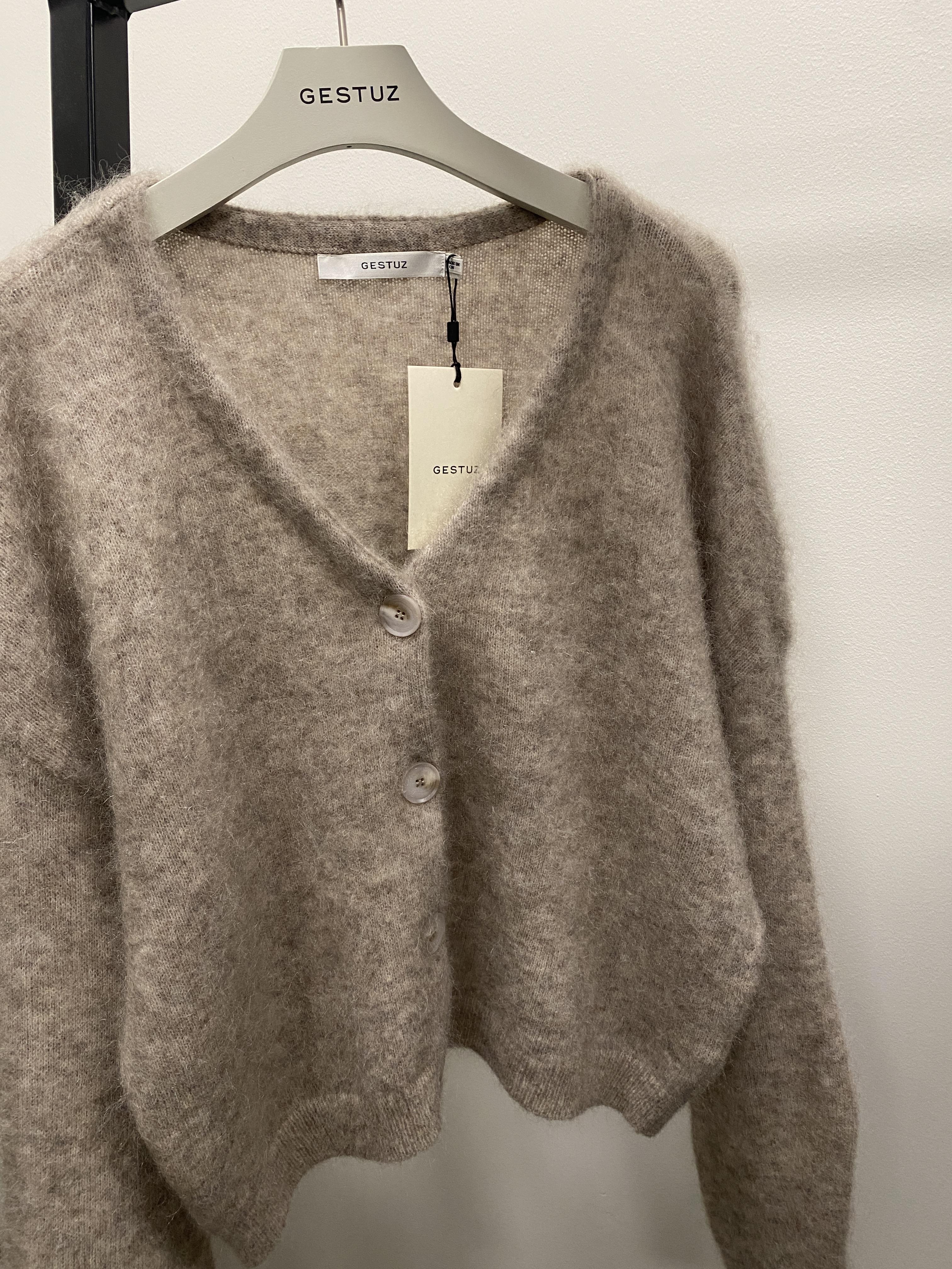 Cardigan i nydelig mohair-kvalitet fra Gestuz. Super ull-blanding som holder seg veldig bra.