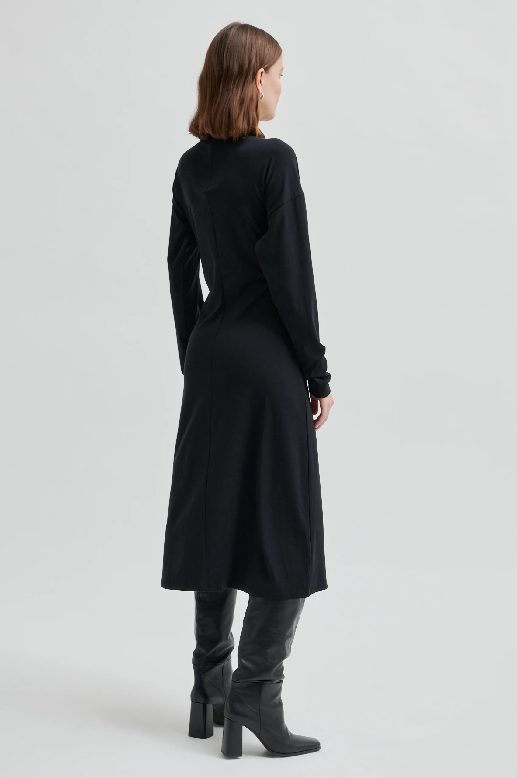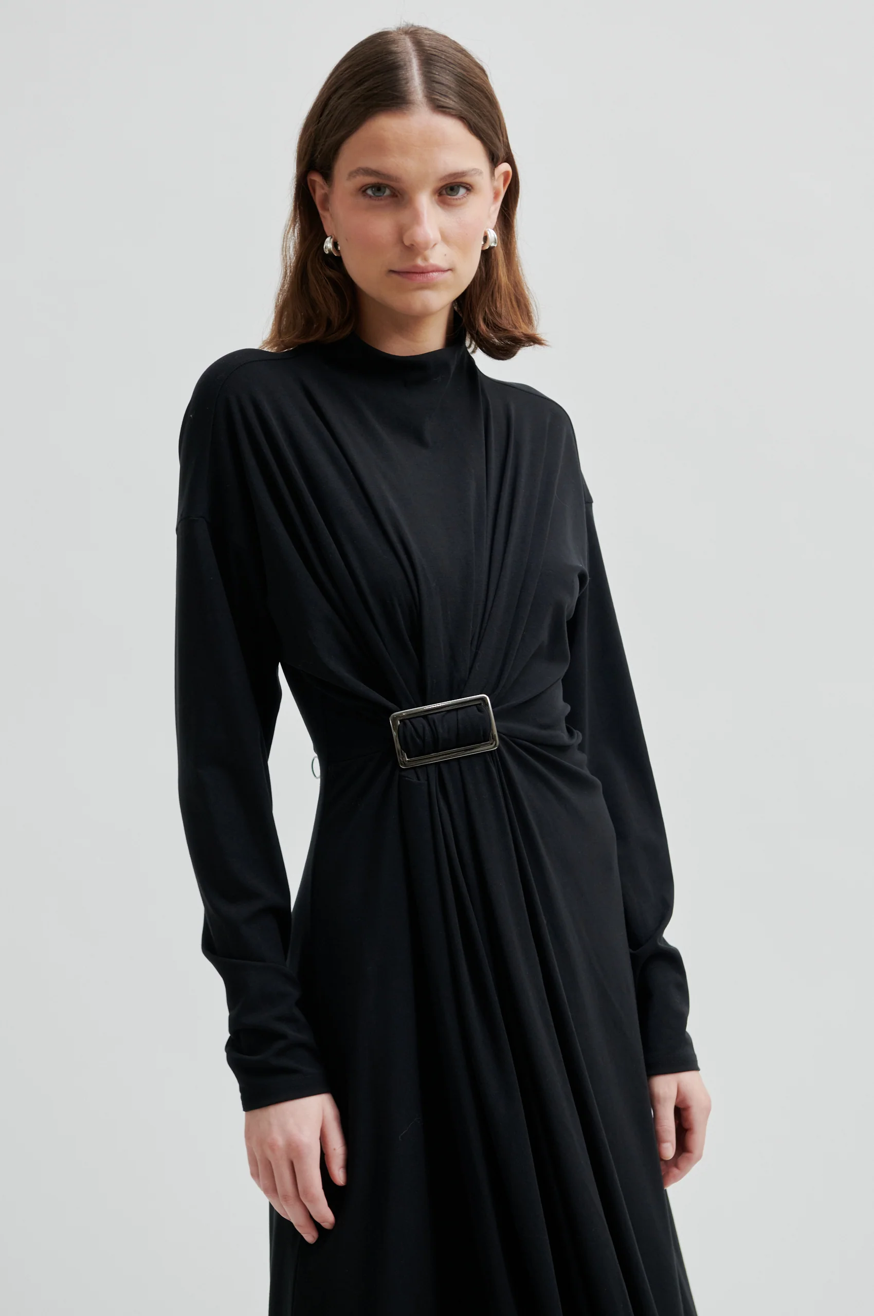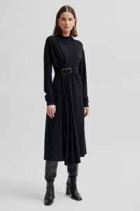 Midi kjole med drapering & beltespenne i livet fra Second Female. Matt stoff.