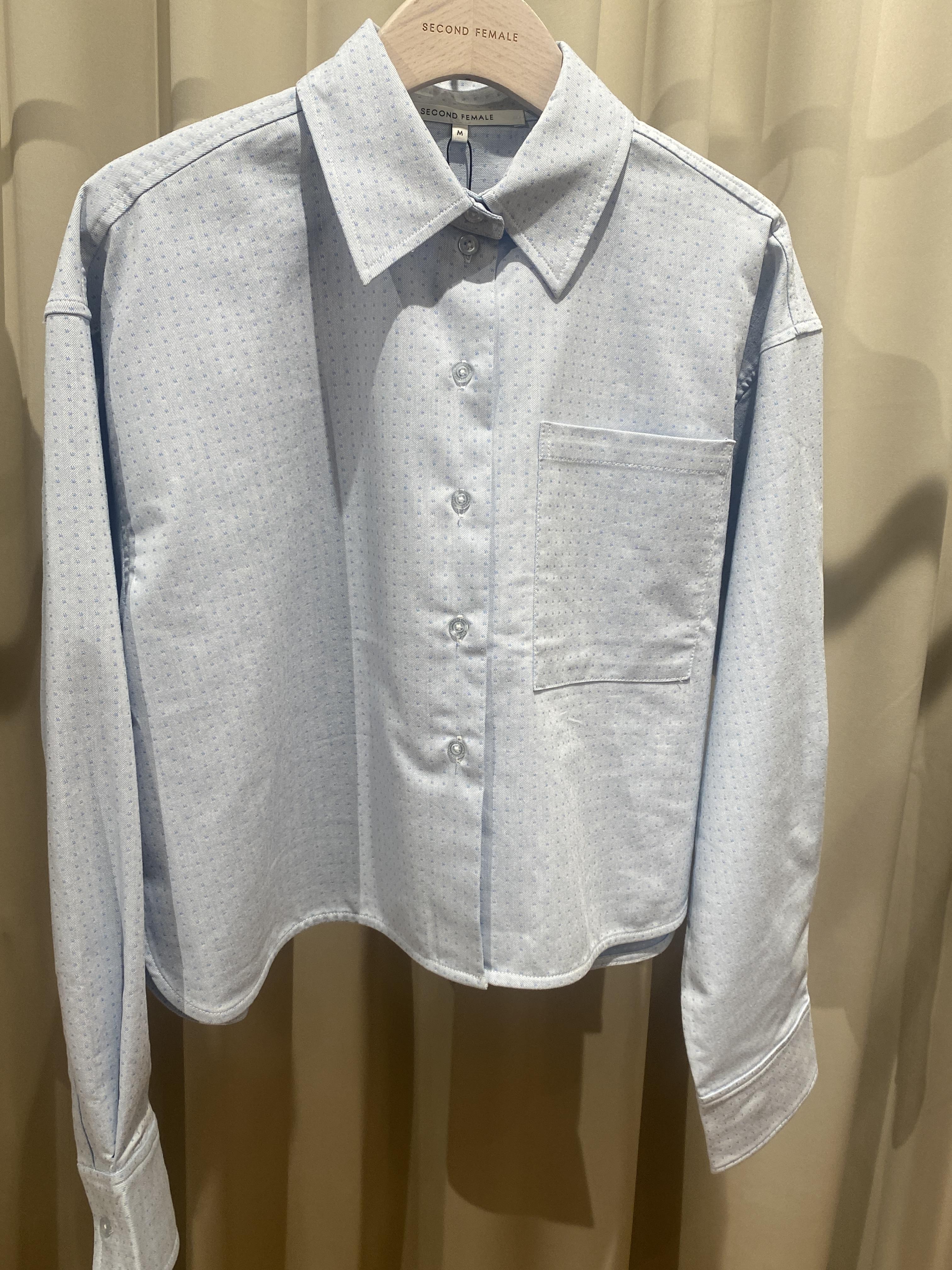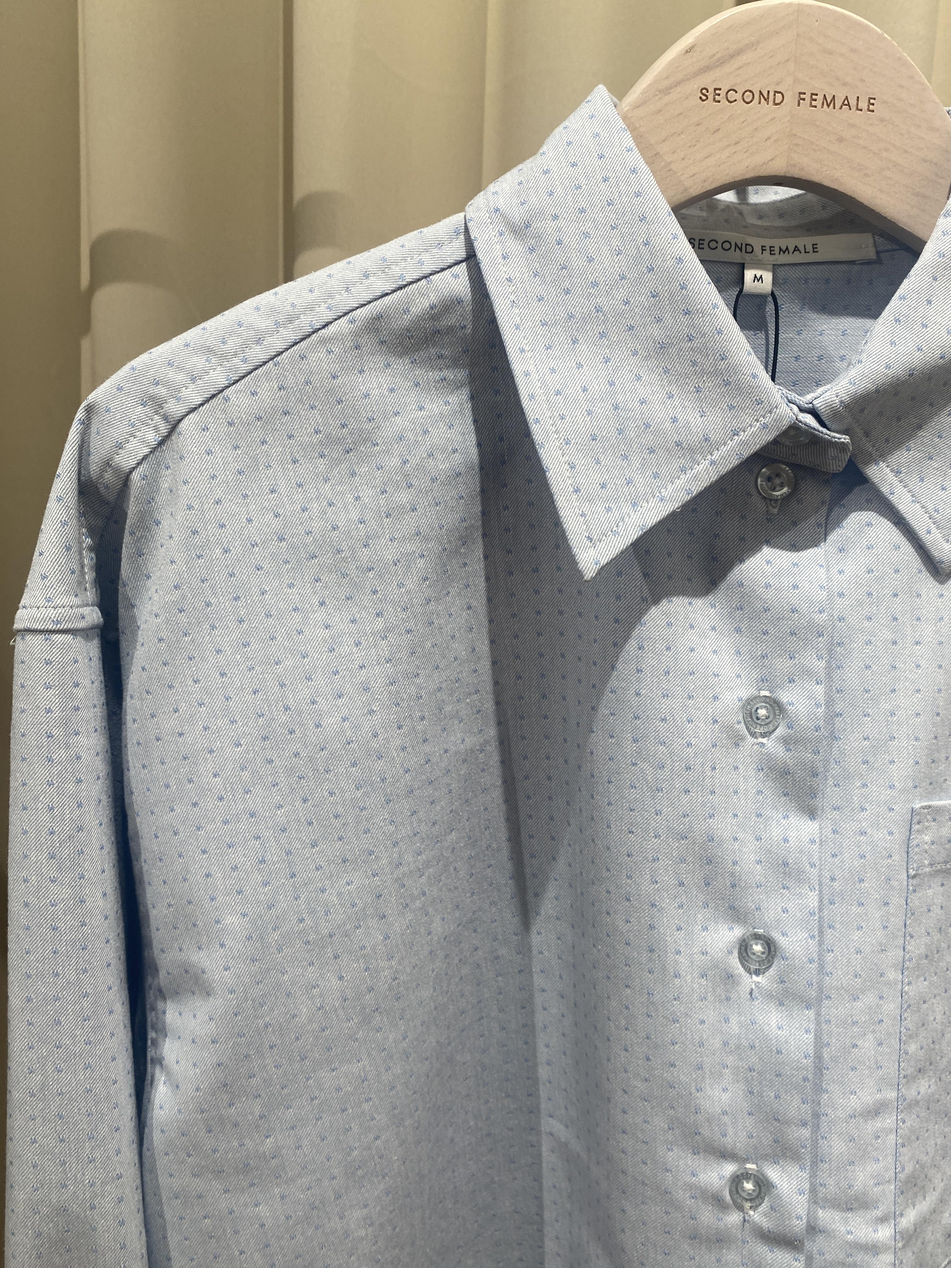Oversize kort skjorte fra Second Female. En lomme i front, legg i ryggen & regulerbar mansjett på ermene. Flott vevd stoff med små "prikker".