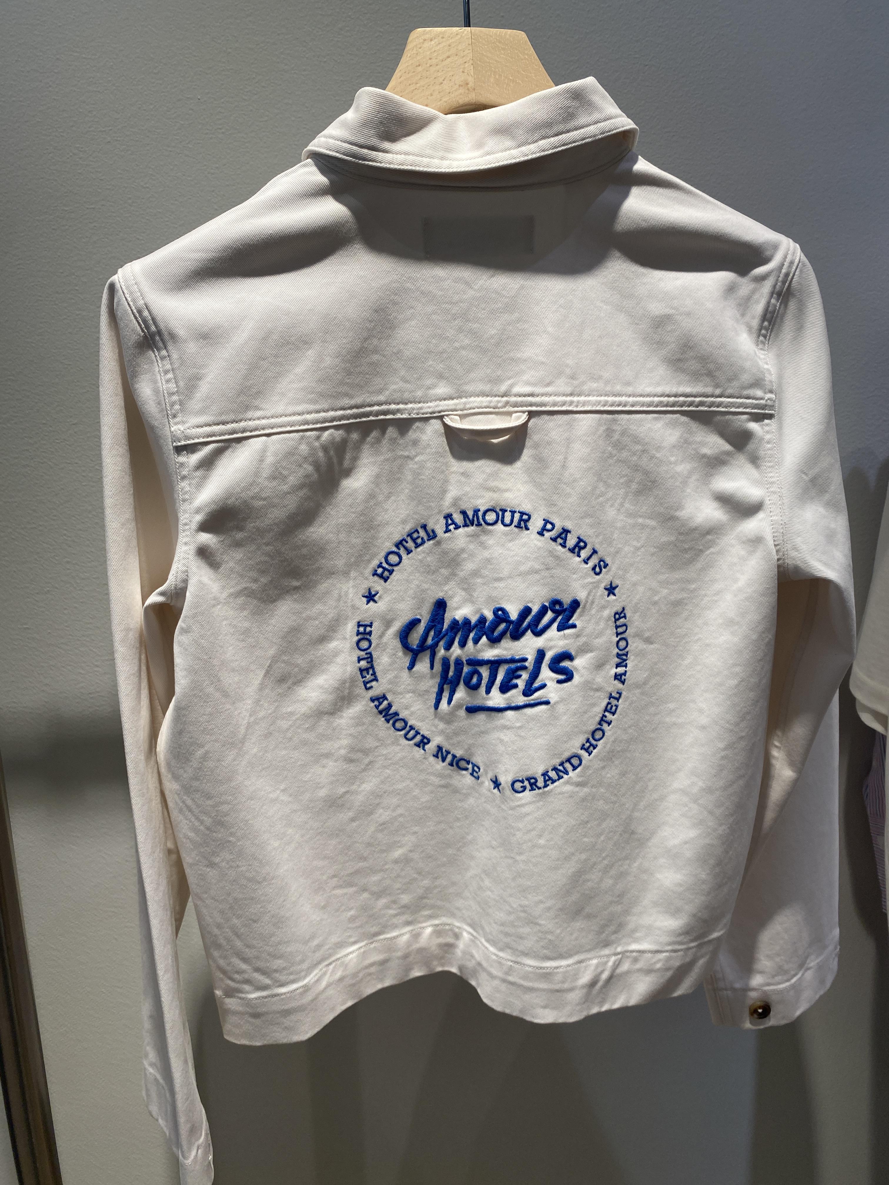 Bomullsjakke med trykk på ryggen fra Selected Femmen i samarbeid med hotellkjeden "Amour Hotels". Bred modell med lommer foran. Kraftig i stoffet.