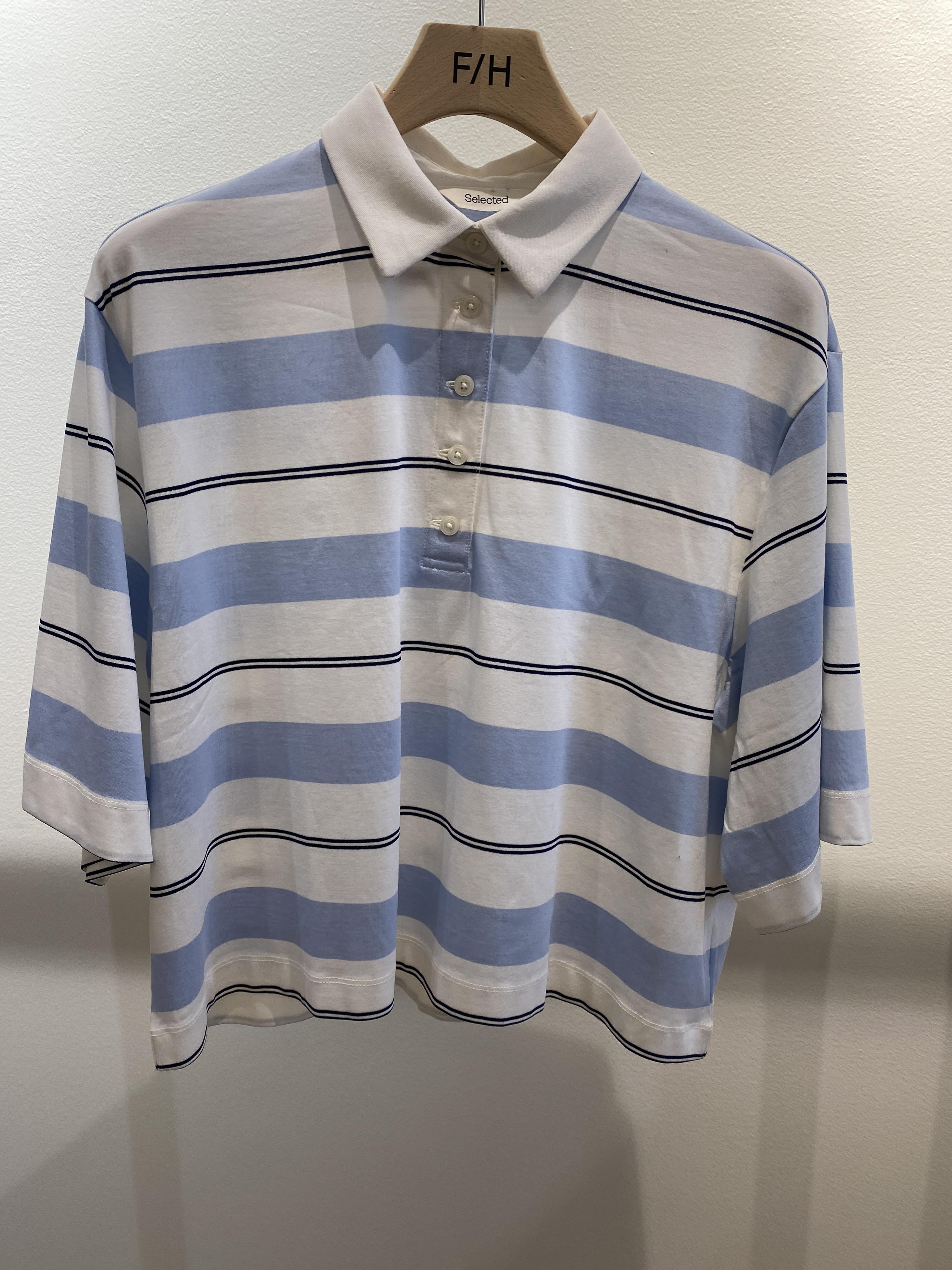 Boxy, stripete t-skjorte med polo-krage fra Selected. 2/4-ermer.