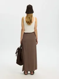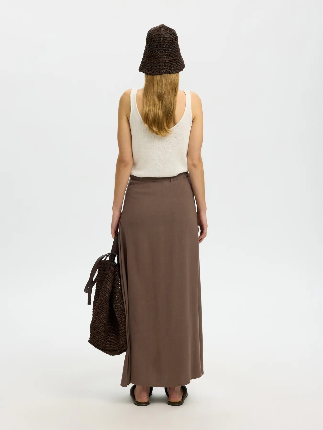 Langt skjørt i linblanding fra Selected Femme. Splitt i sidene & strikk bak i livet. Fint i sett med Viva Cropped Shirt eller Top.