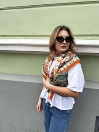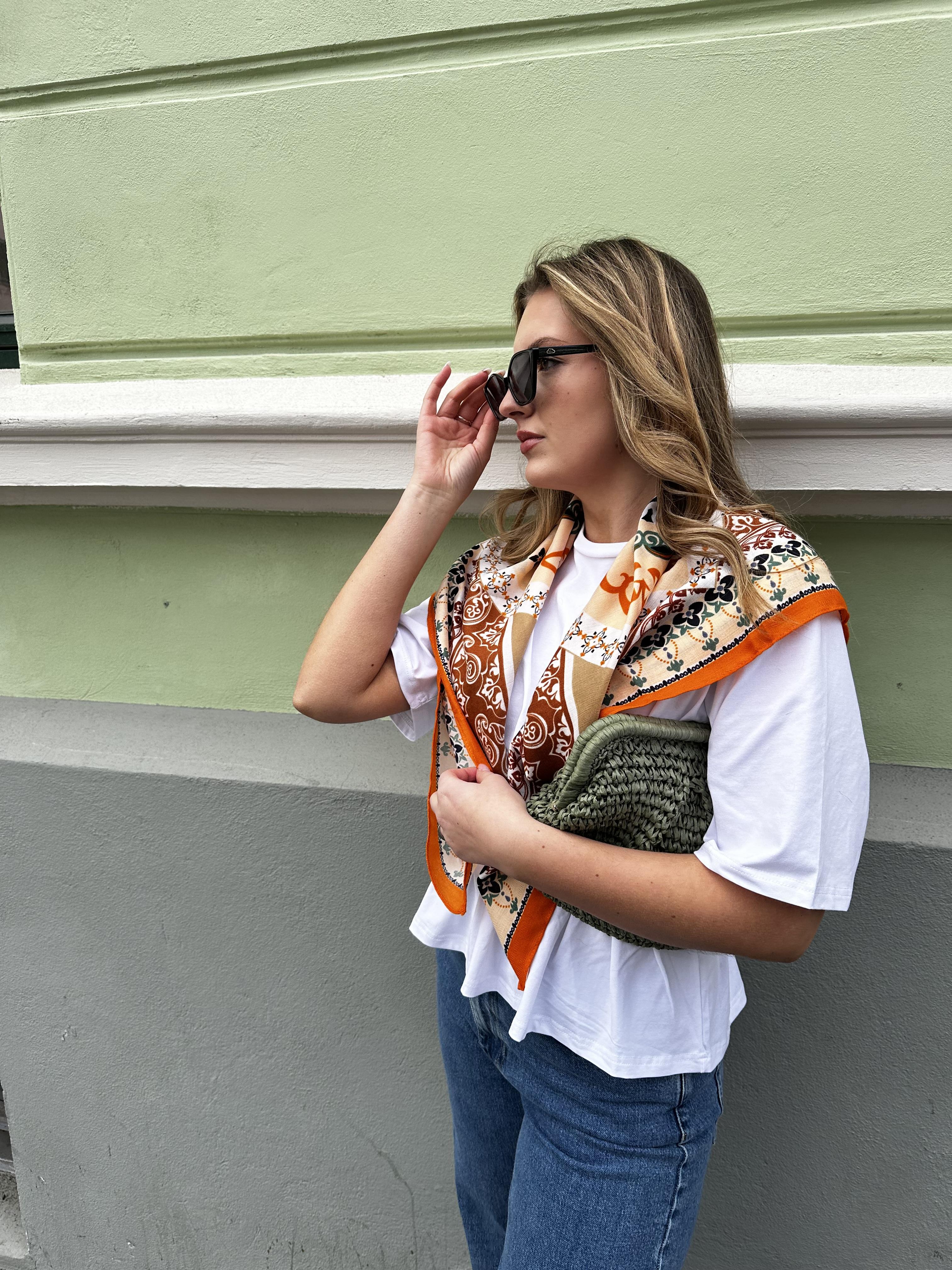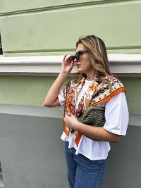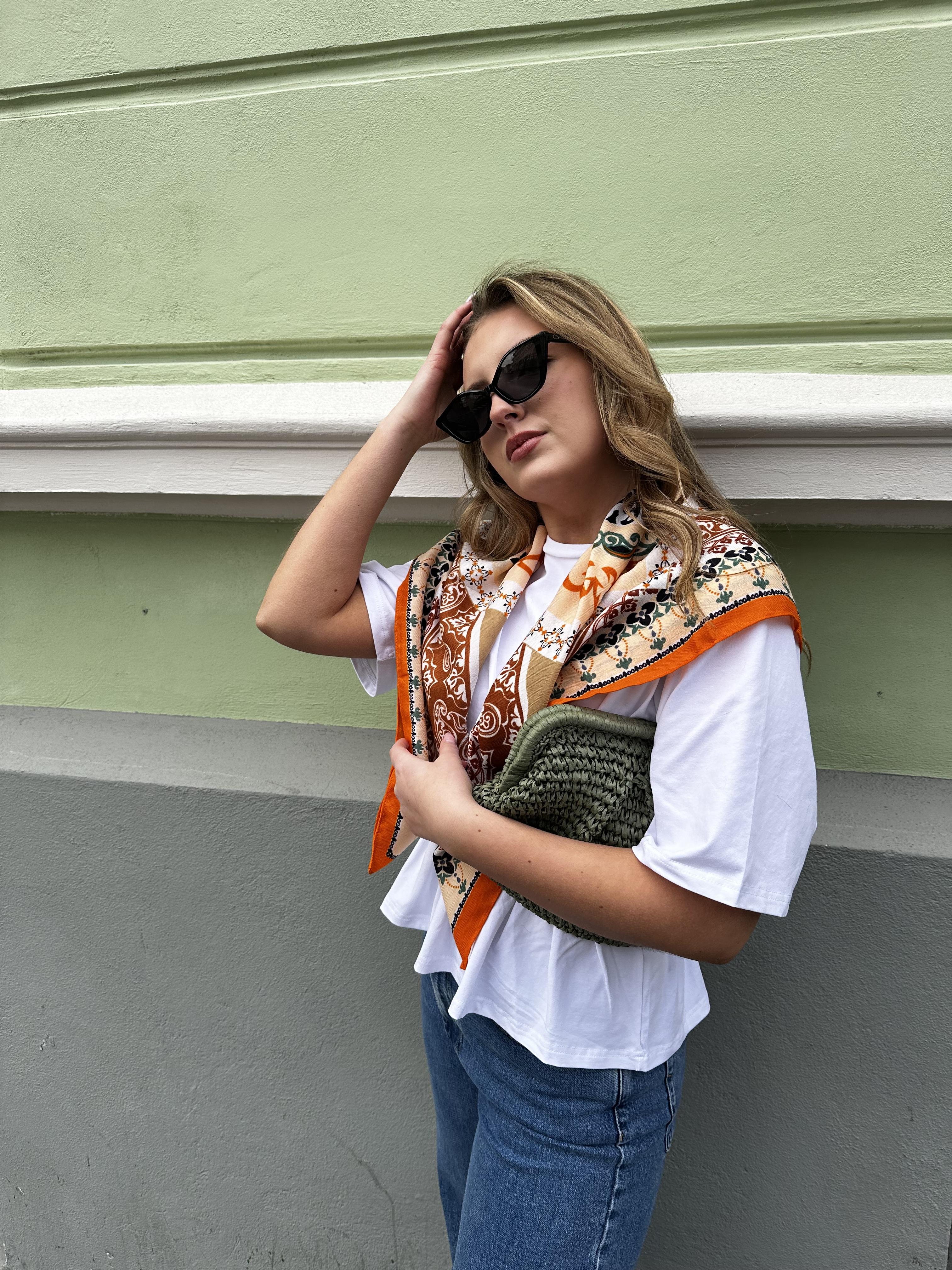 Stort kvadratisk skjerf fra Endless. Fint i halsen, over skuldrene eller i midjen/på jeansen.