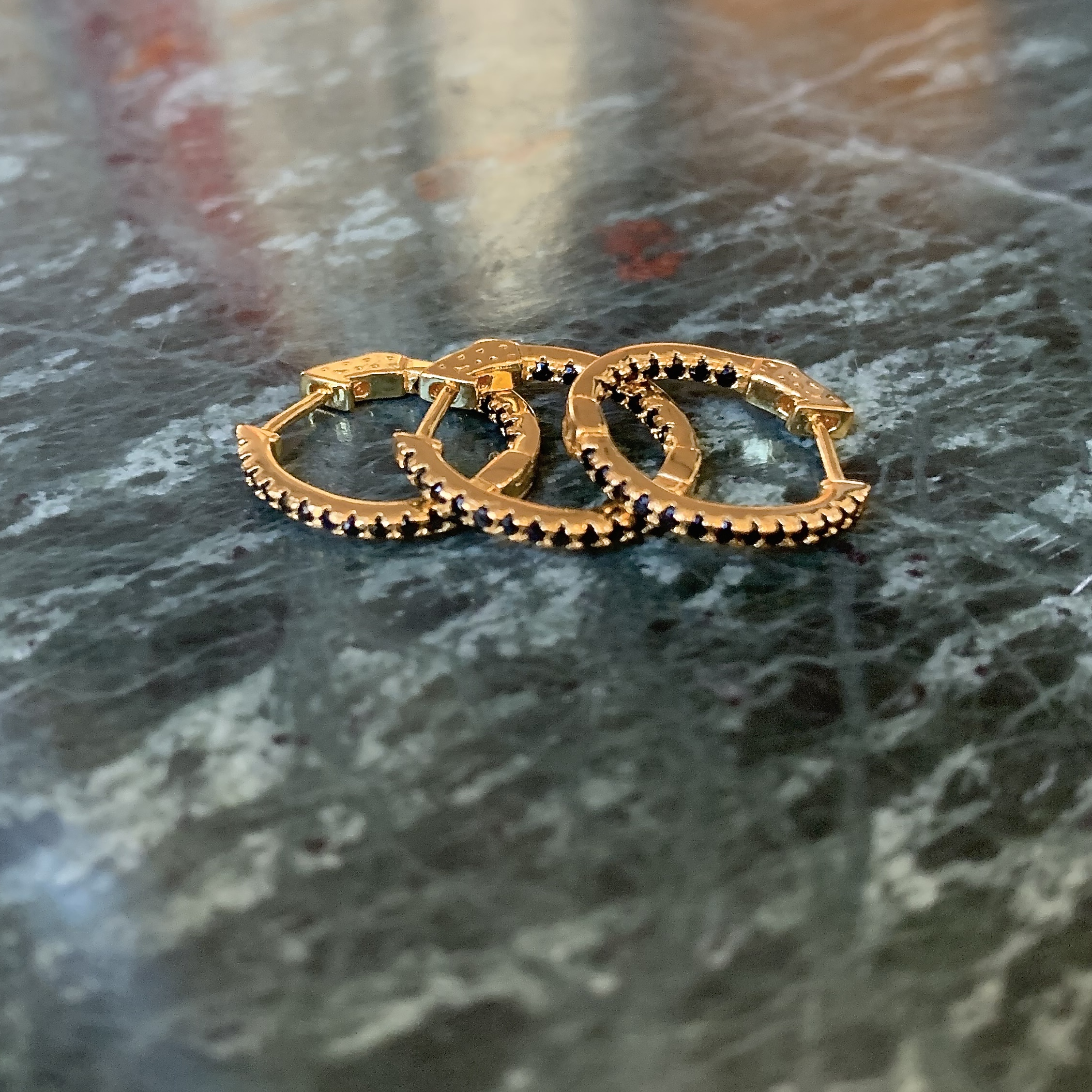 Ørering med sorte krystaller fra Khione. SELGES ÉN & ÉN, ett par koster 500kr.