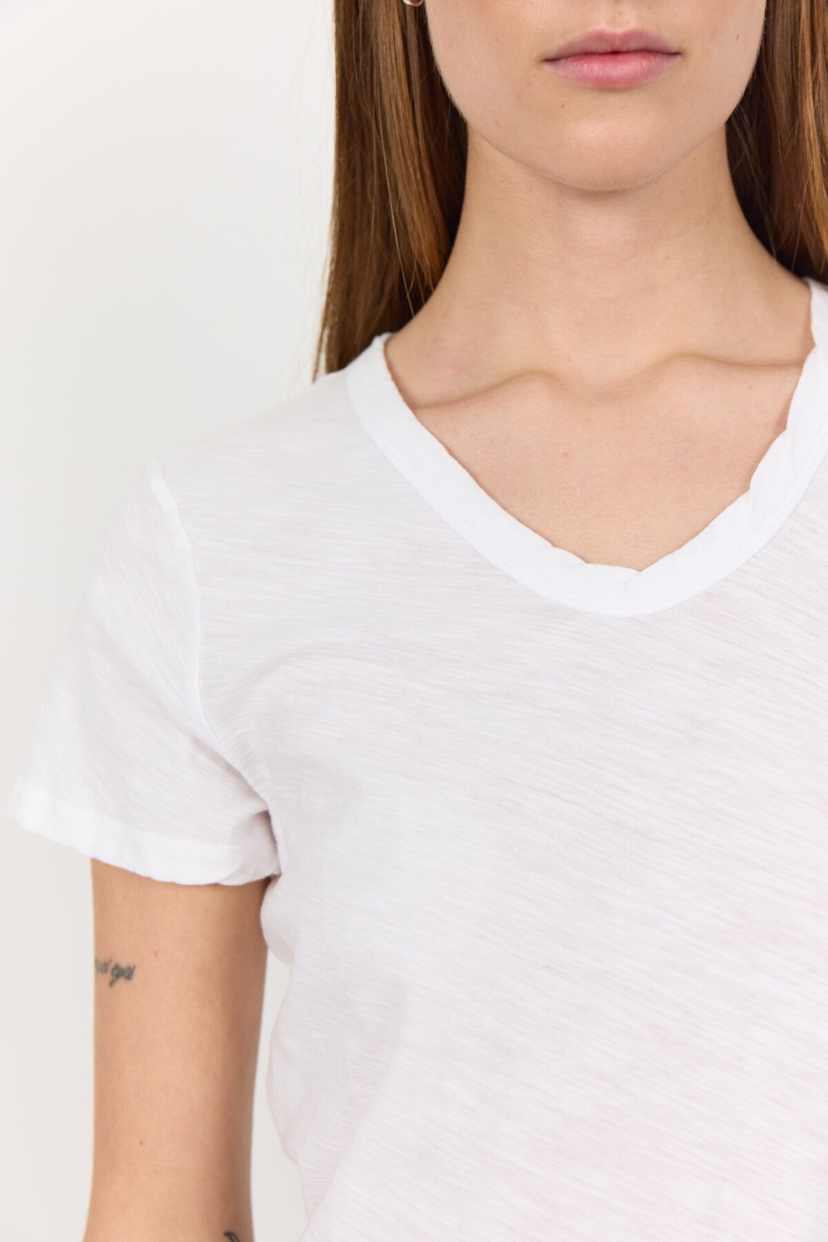Supermyk basetopp med kort erm & v-hals fra Levete Room. Avrundet, v-hals hals. Lett gjennomskinnelig stoff.