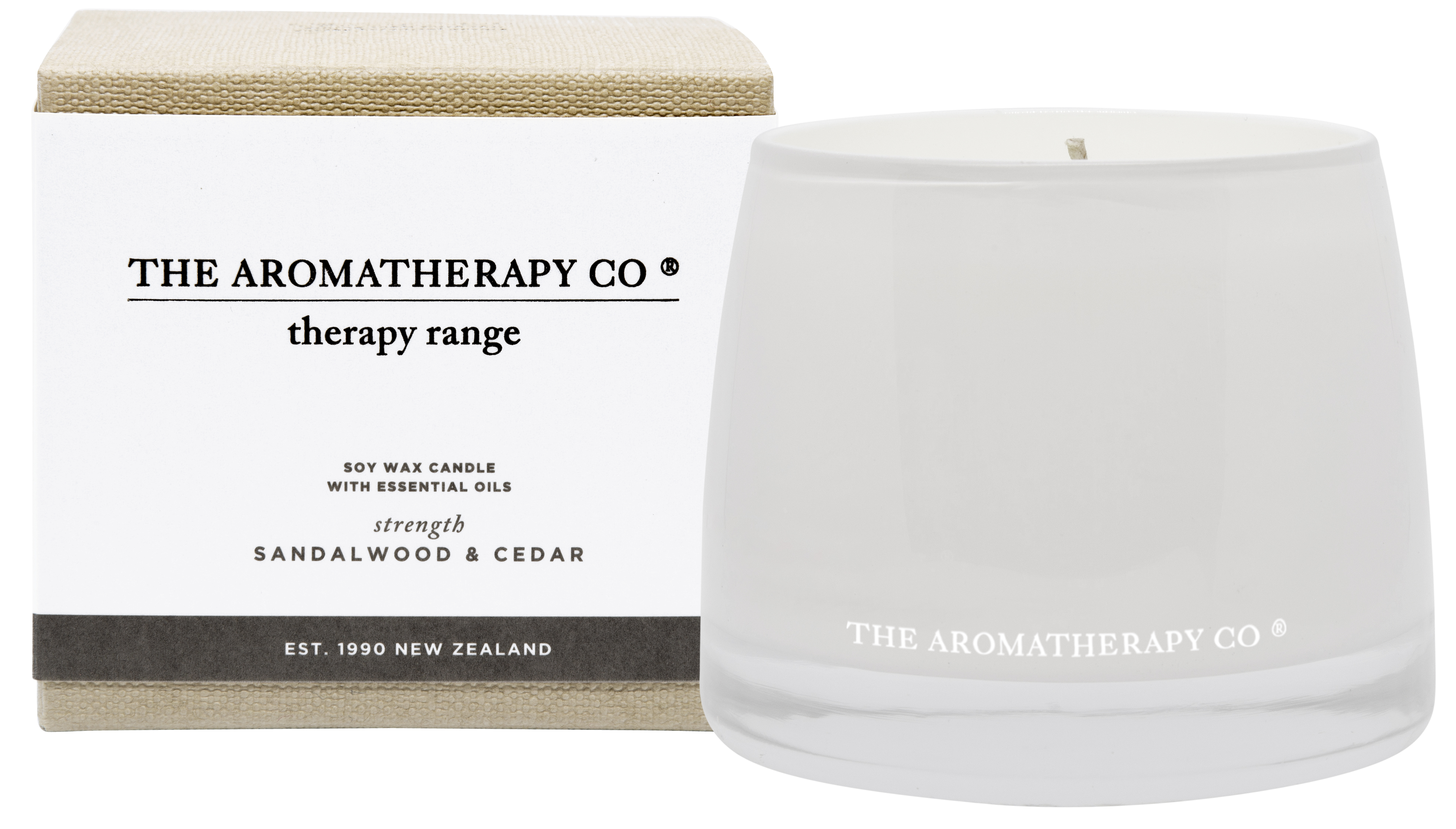 Duftlys fra Therapy Range hos The Aromatherapy Co. Sandalwood & cedar.