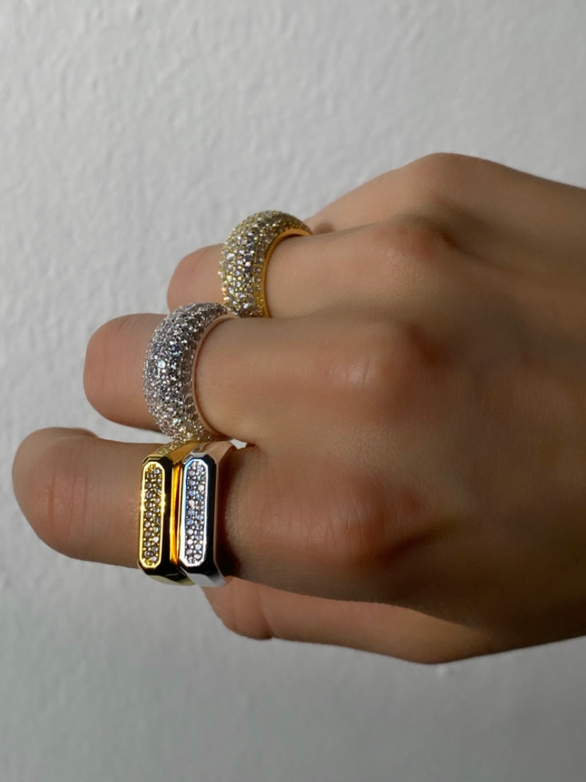 Avlang, flat ring dekket av Zirconia steiner fra WHO IS SHE. Perfekt til å mikse med andre ringer eller alene. Gravert SHE på innsiden.