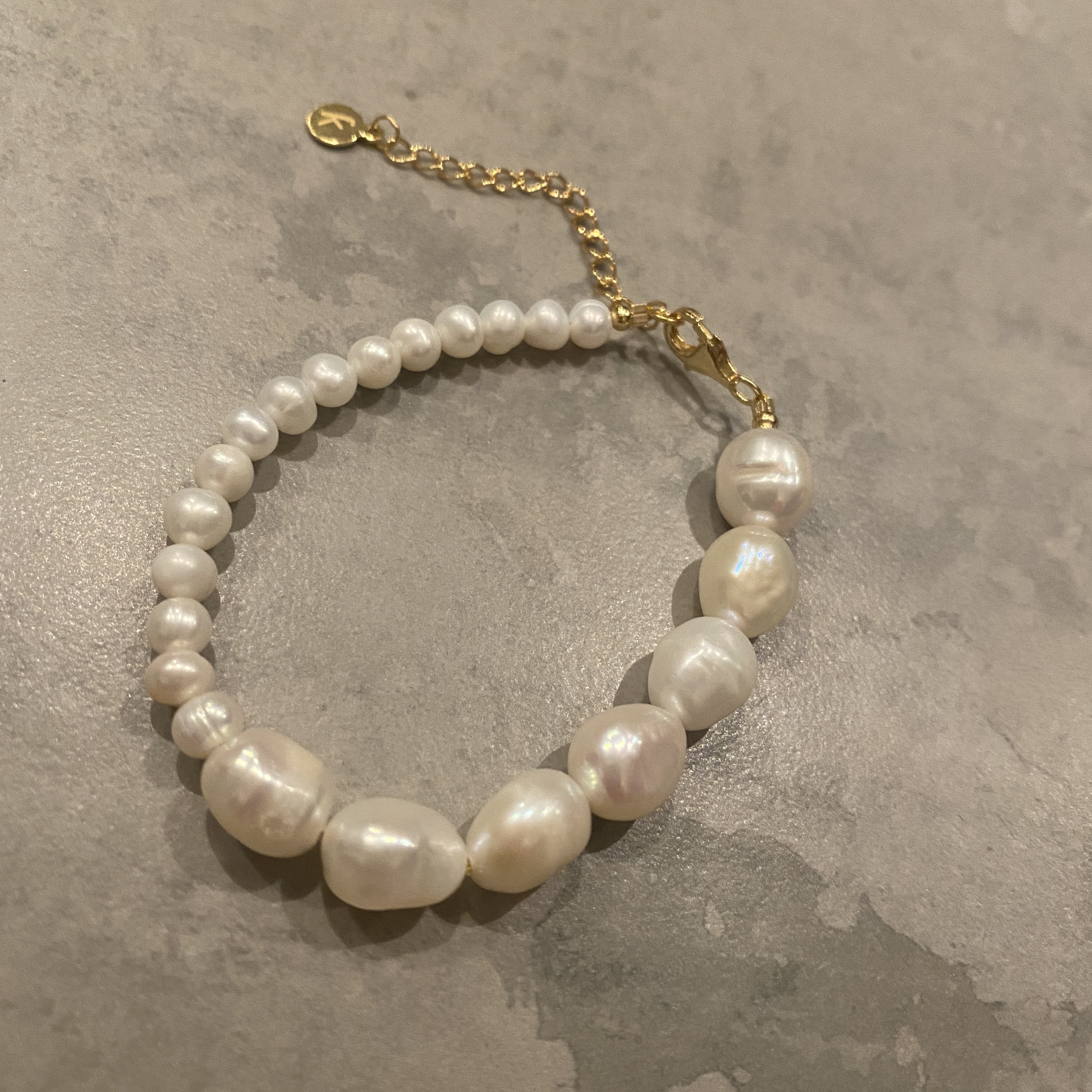 Armbånd med runde ferskvannsperler fra Khione. Stilig med halvparten små & halvparten noe større.