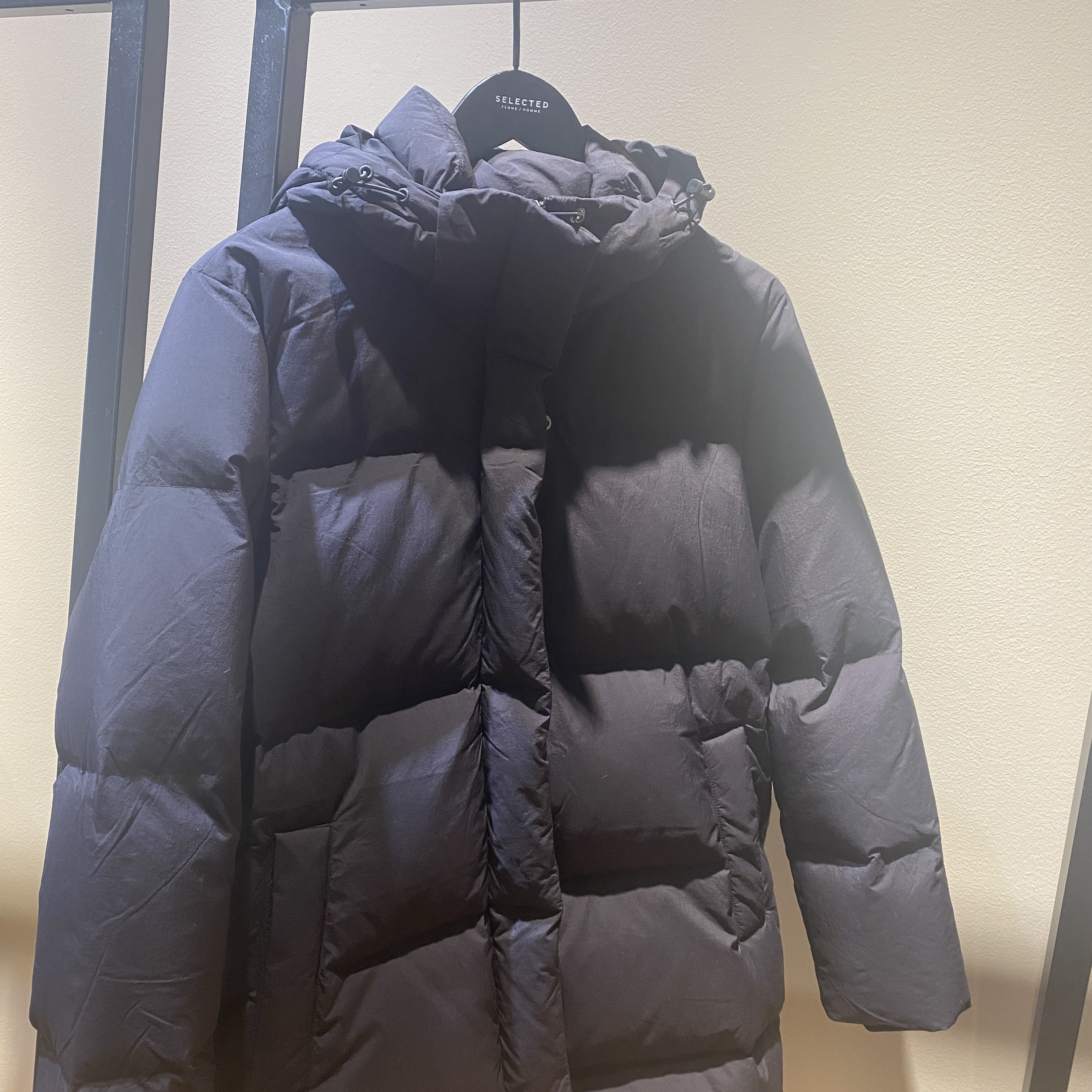 Dunjakke med hette fra Selected Femme. Glidelås- og trykknapp-lukking, strikkemansjetter & lommer i front. Ett must til vinteren!