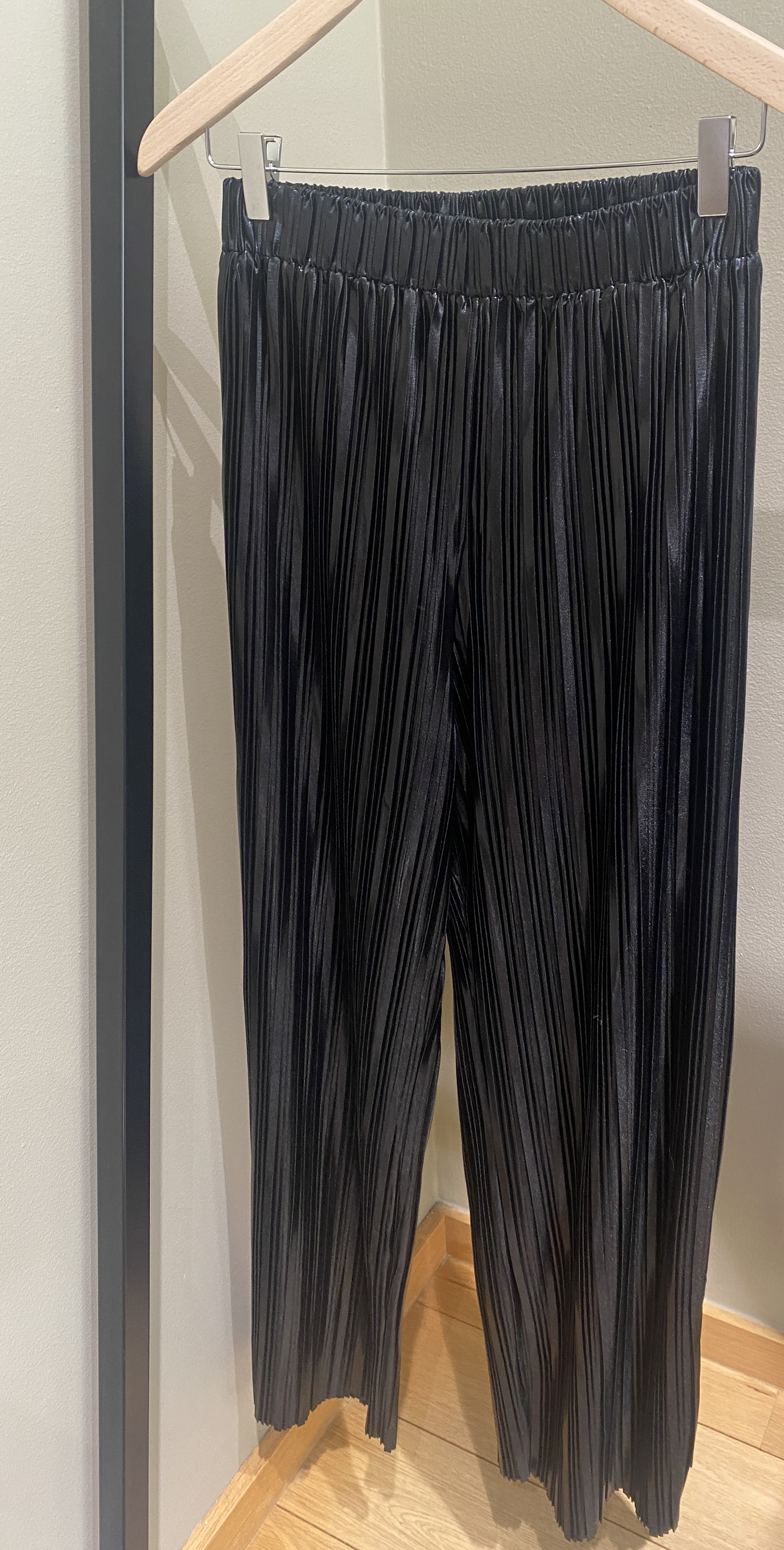 Shiny, vide bukser med plissé fra Selected Femme. Rett modell. Strikk i livet. Fin i sett med Naline High Nick Plisse Top.