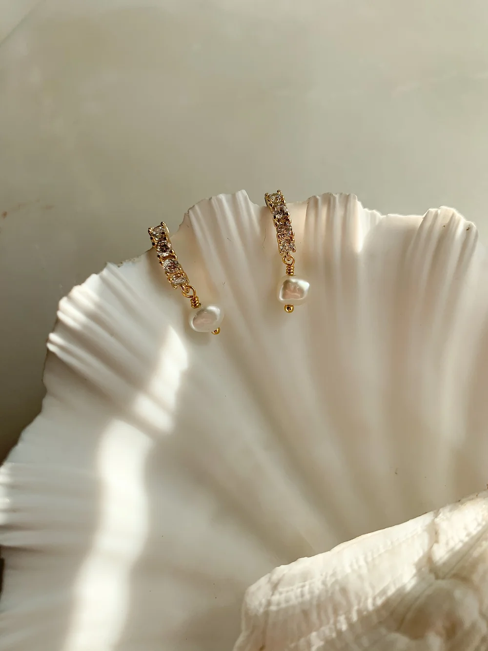 Ørering i gullforgylt sølv og zirkoner. Anheng i gullforgylt messing og ferskvannsperler.