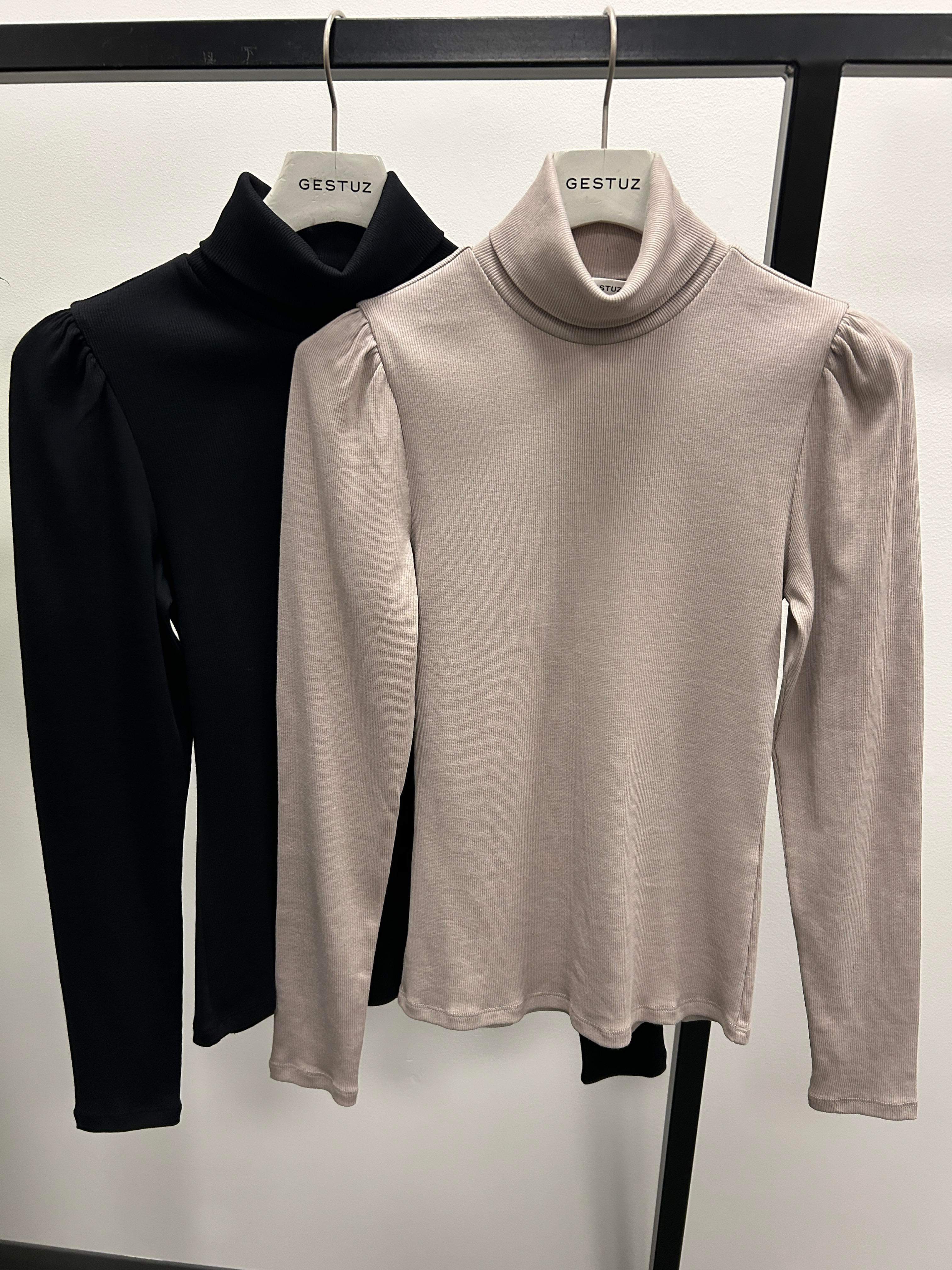 Høyhalset topp i ribbestrikk fra Gestuz. Smal modell med god stretch. Puff-detaljer på skuldrene.
